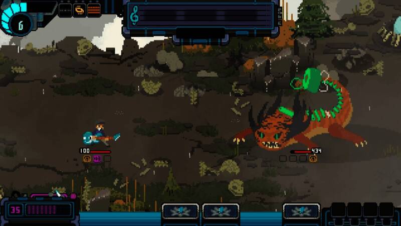 游戏的玩法围绕音乐元素展开,玩家需要在多个音乐主题的生物群落中探索,例如“花朵叮当作响的森林”或“自带旋律的海滩”,收集“重复乐段”(Riffs)和乐器配件(如琴弦、效果器),用于强化角色能力。战斗系统则采用策略编曲机制,玩家可以组合不同乐段形成“独奏连击”,例如高伤害连击、吸血效果或随机混战模式。终极技能“渐强攻击”需要完成类似《吉他英雄》的节奏挑战,精准输入按键以释放爆发性伤害。每个Boss都有独特的音乐主题与机制,如巨型吉他剑士或扬声器蜘蛛,战斗如同参与一场乐队对决,需要玩家灵活调整策略。