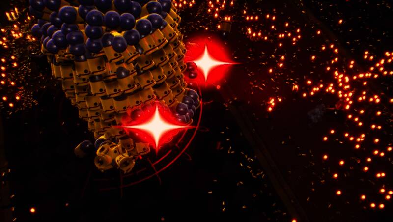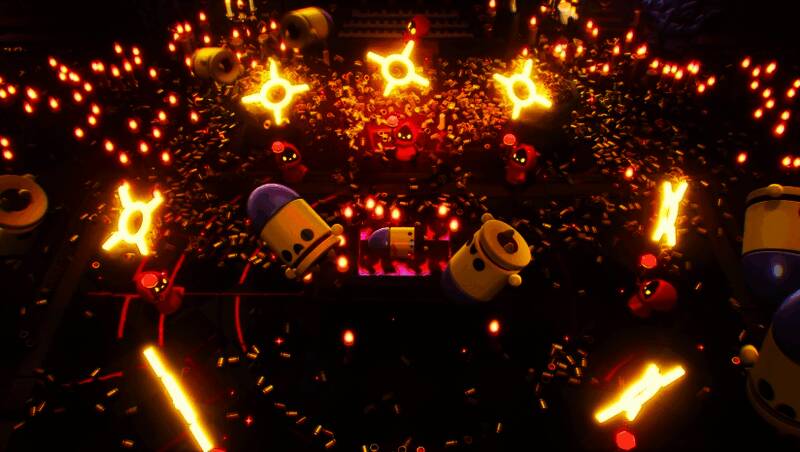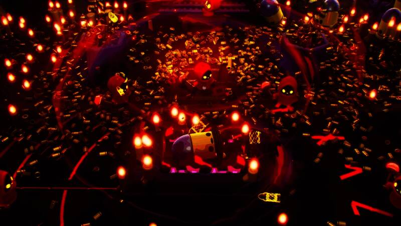 美术风格由2D像素全面升级为立体3D建模,物理引擎加持下敌人可被击飞、抛掷,战斗更具动态张力。画面设计遵循“极小狗屎法则”,红白高对比色圈清晰标识子弹轨迹,即使在弹幕风暴中也能快速判断危险区域。暗色调场景突出光影层次,配合粒子特效与环境破坏反馈,再辅以高速战斗专属摇滚配乐,营造出紧张刺激又极具爽感的沉浸体验。