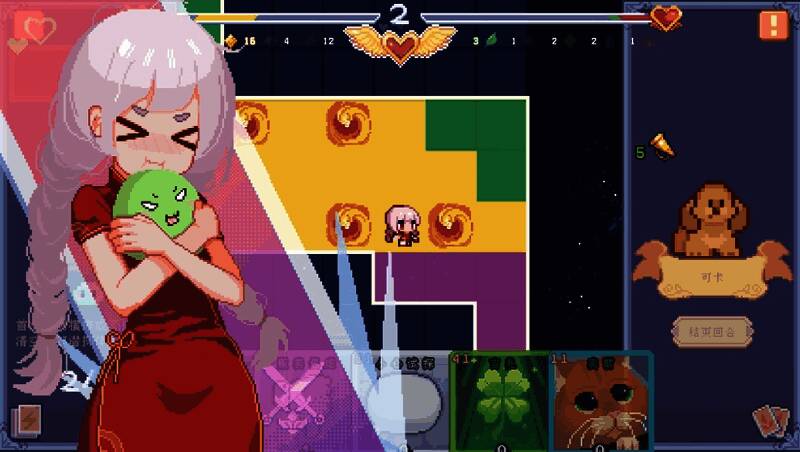 游戏采用精致细腻的像素美术风格,整体视觉呈现浓厚的奇幻童话氛围。宠物街的复古店铺、河岸老屋与节日装饰充满生活气息,而里世界的暗影战场则以冷色调与动态光影营造神秘压迫感。角色设计萌系十足,小鲤的金鱼尾发饰与水波特效细节生动,配合宠物互动时的光影反馈与卡牌战斗的华丽特效,极大增强了沉浸体验。