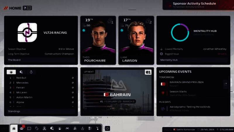 玩家能够创建属于自己的车队,努力争夺发车格位置,缔造新的传奇,亲身体验从无到有打造一支F1车队的完整过程。
