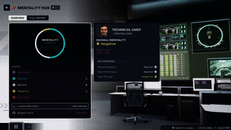 全新的心态系统让游戏更具真实感和不确定性,车手和员工的心态会受到比赛成绩、赛车性能、薪资待遇等多种因素的影响,进而对车队的表现产生作用。