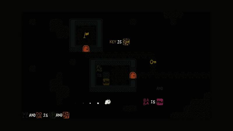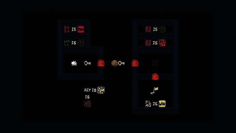 游戏中的文字块,例如“Baba Is You”“Flag Is Win”等代表着游戏规则。玩家可以推动这些文本块,改变它们的组合来创造新规则。比如将“Baba Is You”改成“Baba Is Stop”,Baba就无法移动;把“Flag Is Win”改成“Rock Is Win”,玩家摸着石头就能过关。