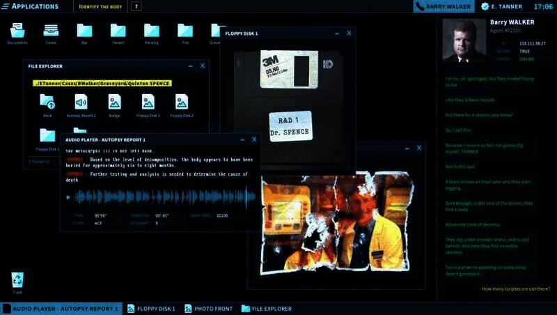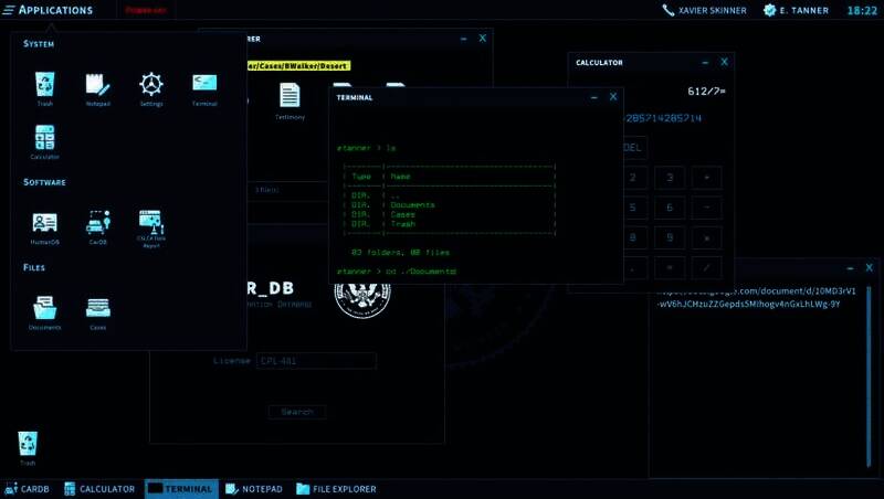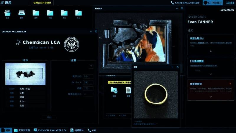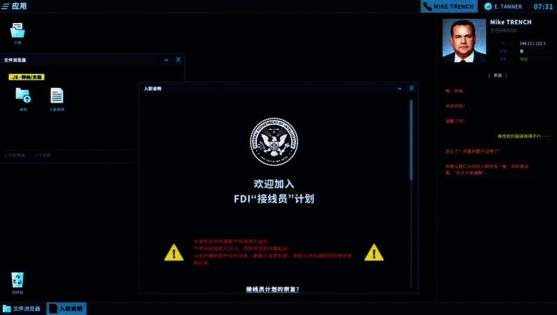 游戏采用极具科技感的复古办公 UI,屏幕就像公司办公电脑。桌面上有聊天框、工作相关文件夹和回收站,玩家浏览案件信息和查阅资料时,通过不同任务窗口展示,操作方式与日常使用电脑类似,有效增强了代入感。