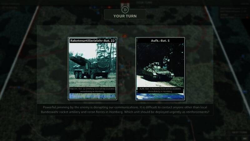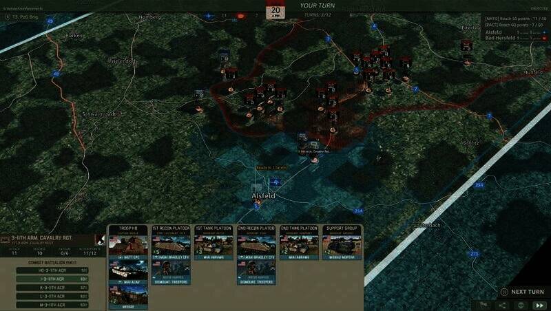 游戏拥有四个规模宏大的回合制战略一般模式战役,聚焦于 1989 年北约中央集团军群和华约苏联中央集群的管辖区域。玩家能够指挥数百个单位和序列,最小可到排级。